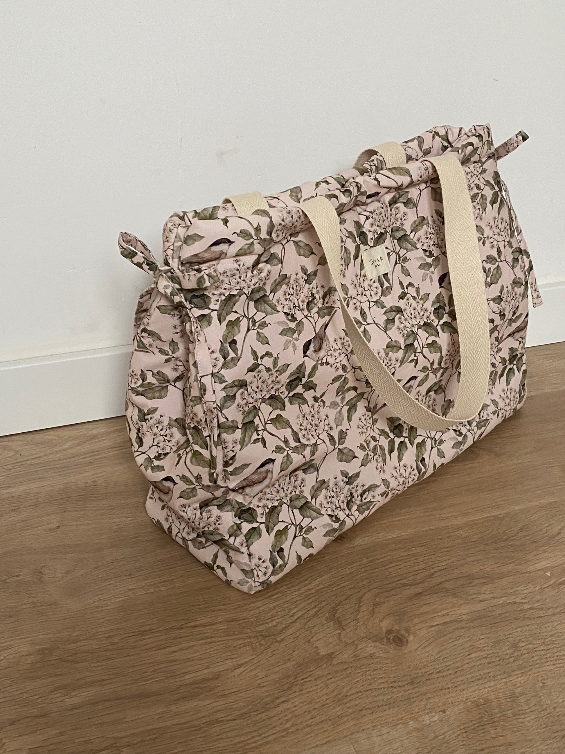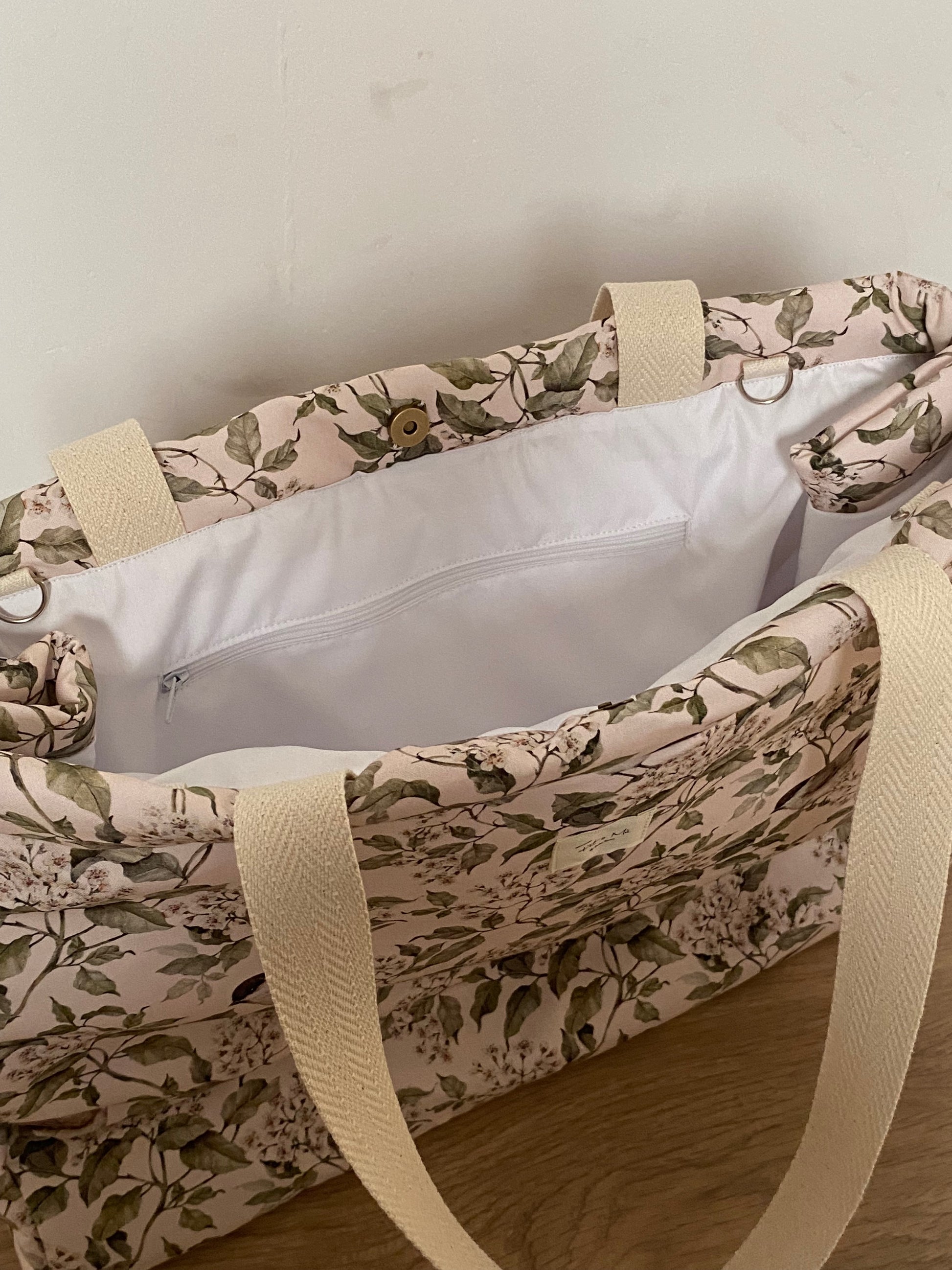 Confeccionada a mano en tela de algodón, aporta un estilo elegante y versátil que combina con cualquier carrito. Sus asas de algodón resistente permiten llevarla cómodamente al hombro o colgarla en el manillar del carrito gracias a los prácticos enganches laterales.