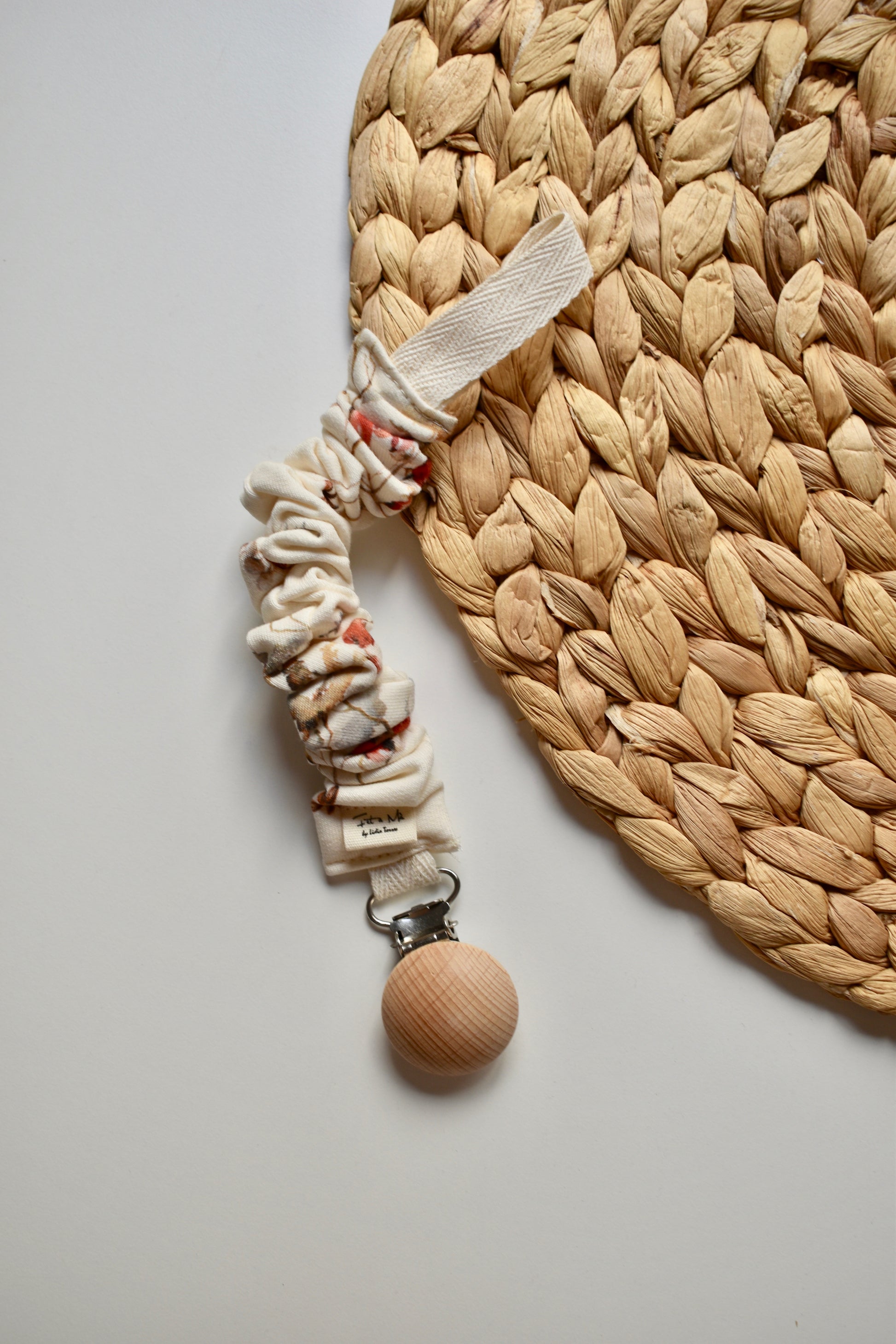 Nuestro chupetero está diseñado para mantener el chupete o los juguetes favoritos siempre a mano y a salvo, evitando que caigan o se pierdan. Su pinza de madera aporta un toque cálido y combina perfectamente con cualquier look.