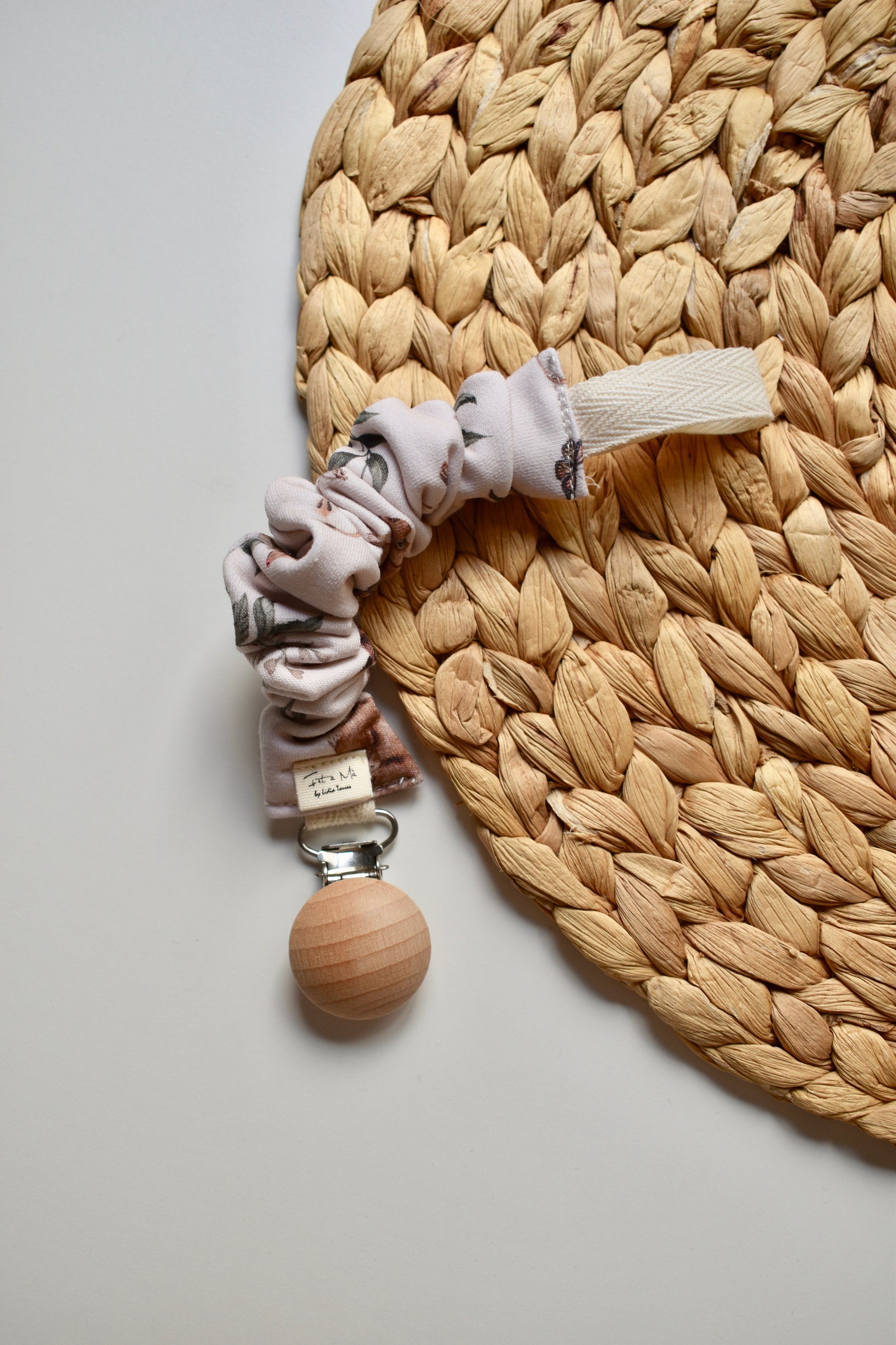Nuestro chupetero está diseñado para mantener el chupete o los juguetes favoritos siempre a mano y a salvo, evitando que caigan o se pierdan. Su pinza de madera aporta un toque cálido y combina perfectamente con cualquier look.