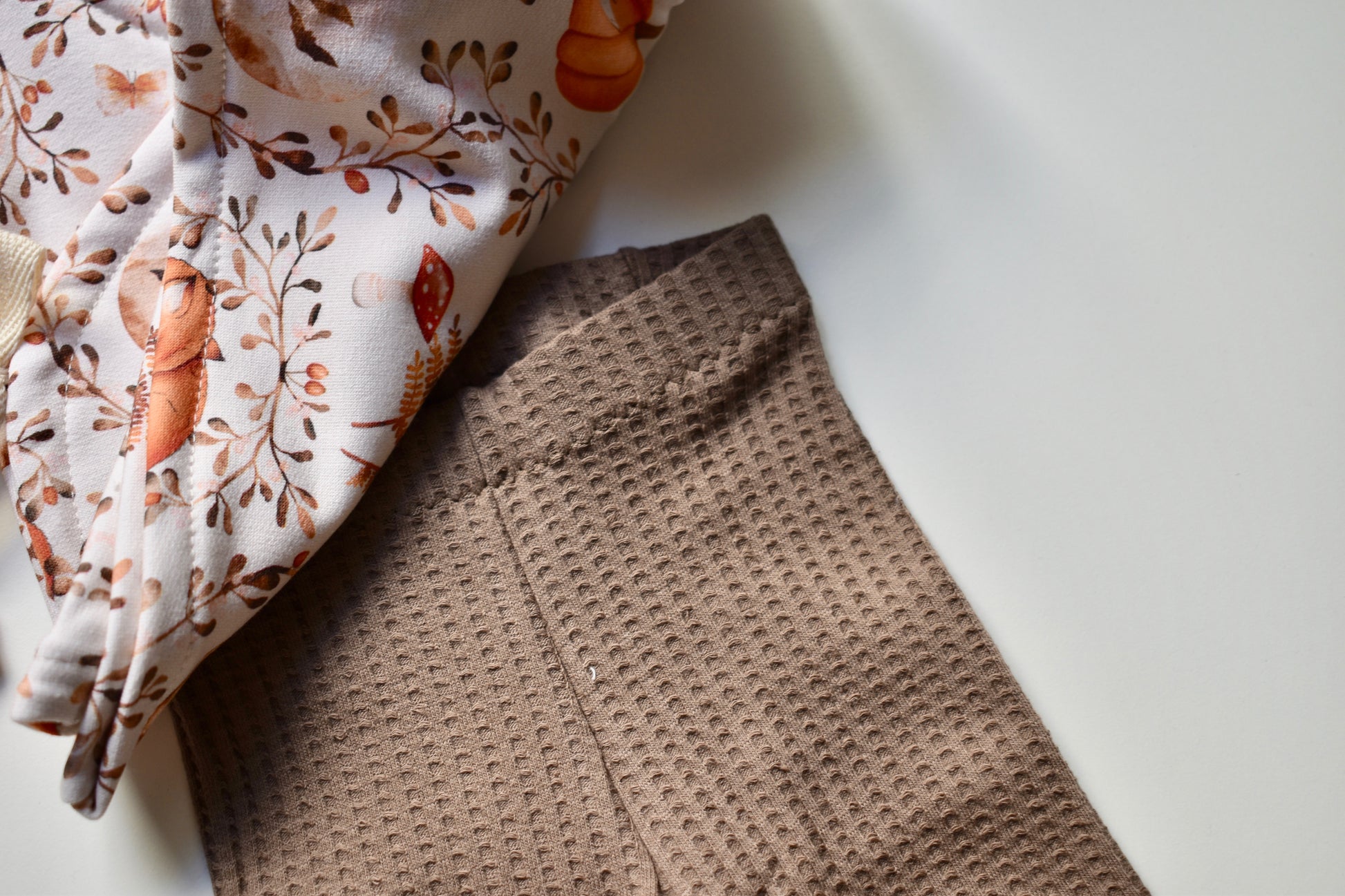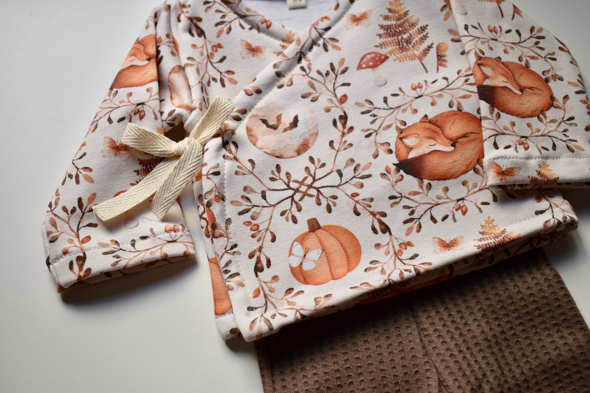 El kimono esta confeccionado con french terry (no afelpado) de algodón orgánico y la parte de abajo esta confeccionada con punto waffle para mayor comodidad del bebé.