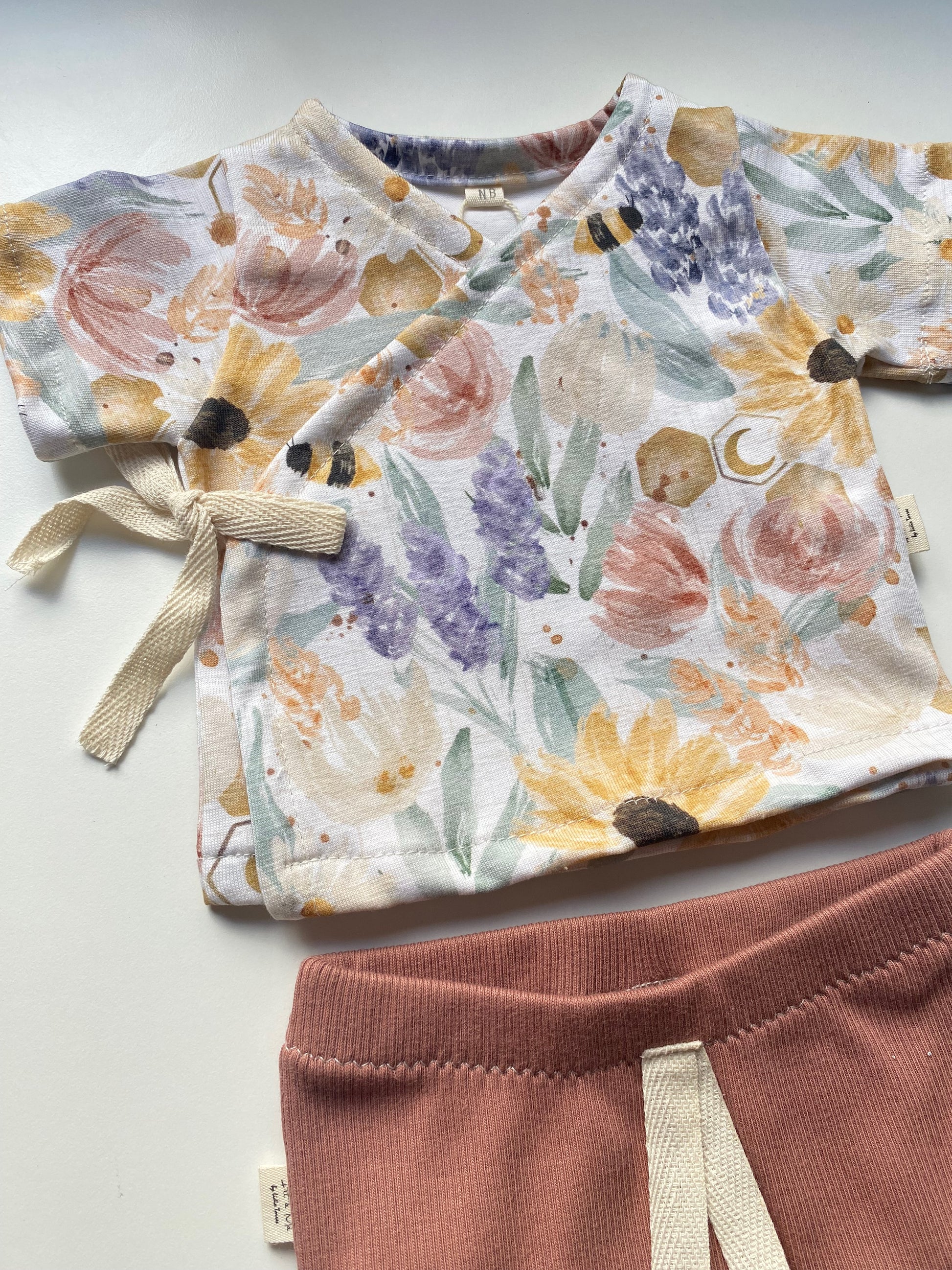 El kimono esta confeccionado con punto jersey de algodón orgánico y la parte de abajo esta confeccionada con punto rib
