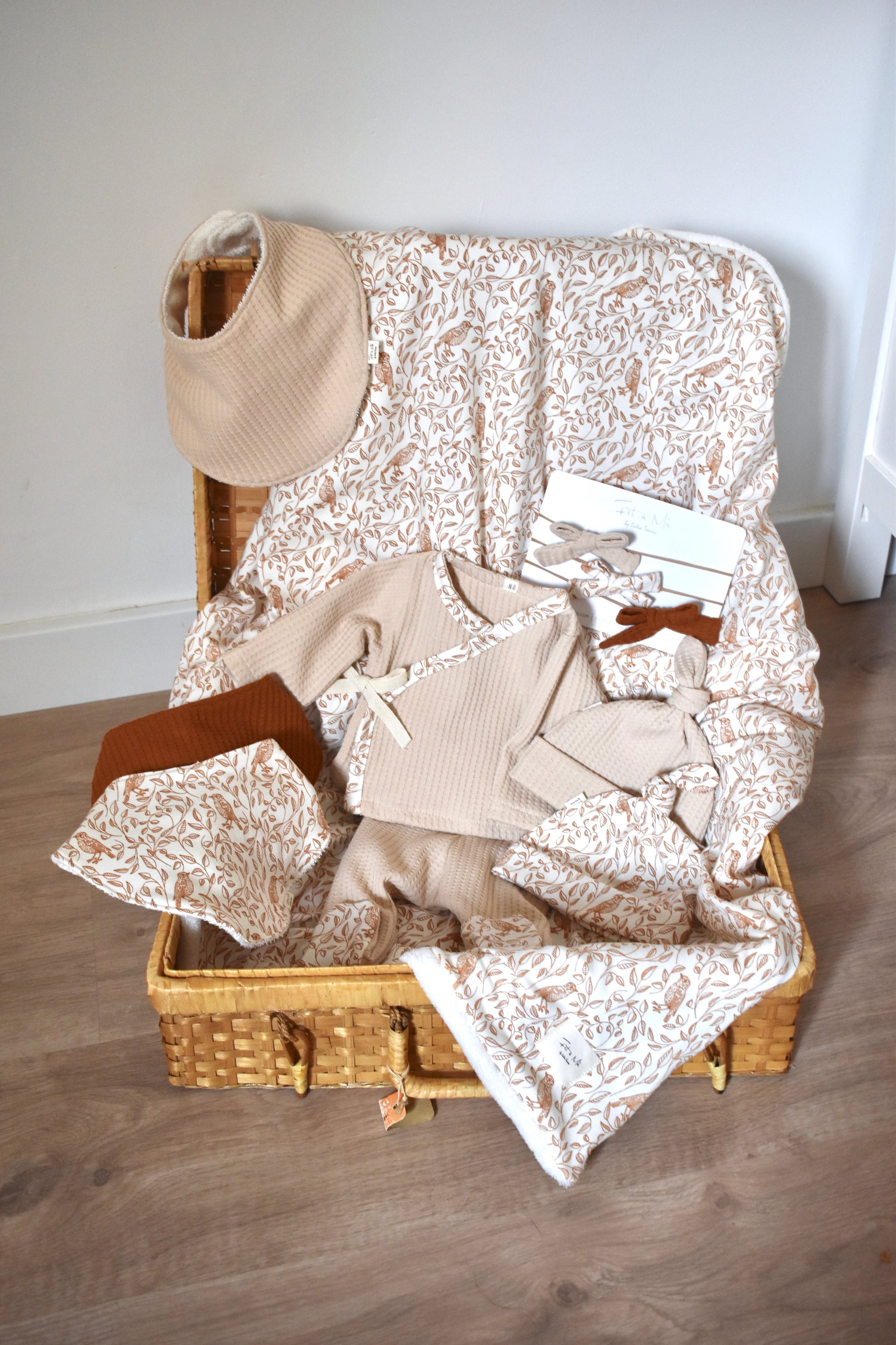 Conjunto de kimono y polaina, perfecto como primera puesta. El cierre interior es un un snap y el exterior se anuda con una cinta de algodón.