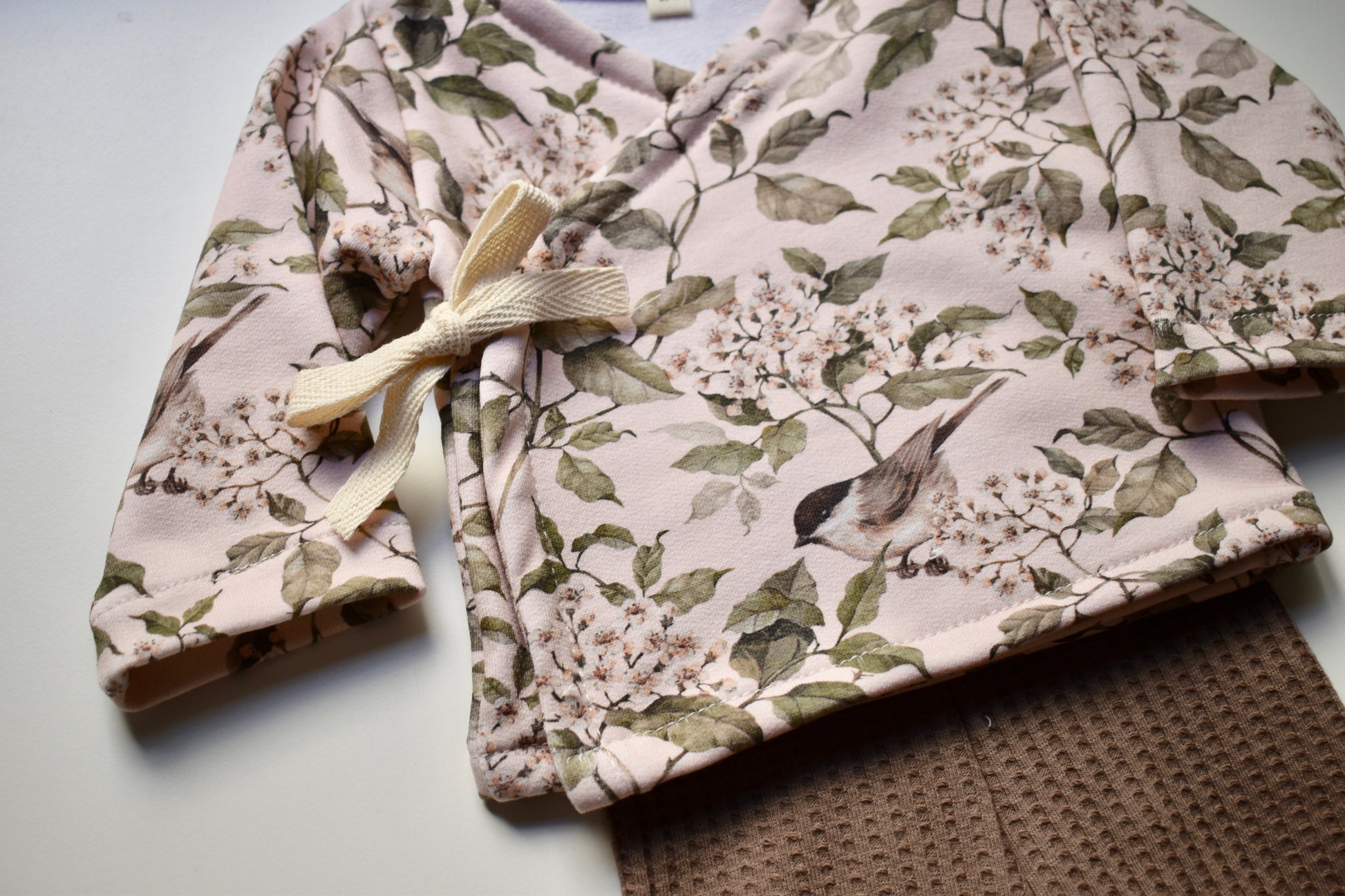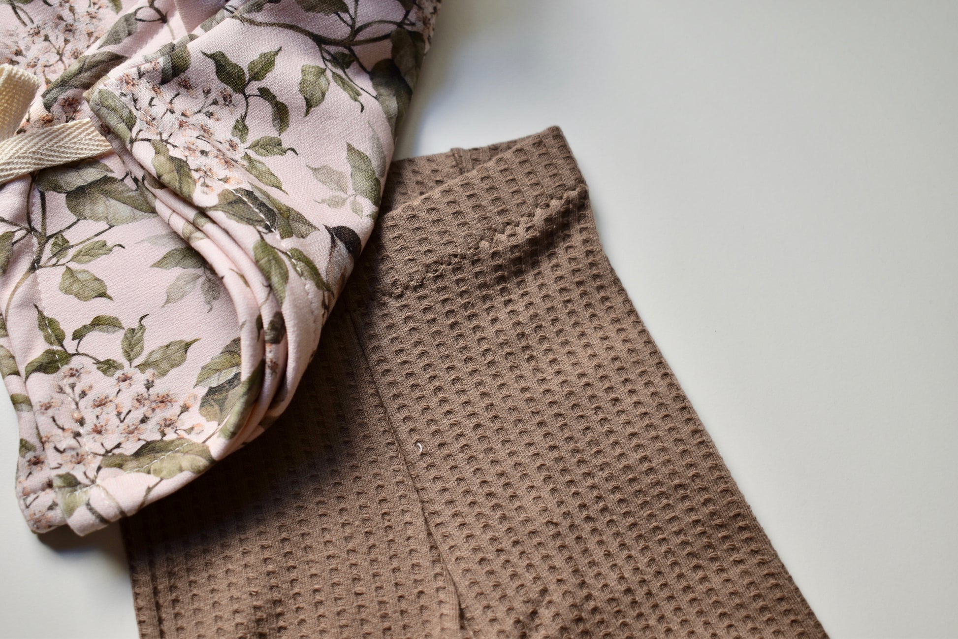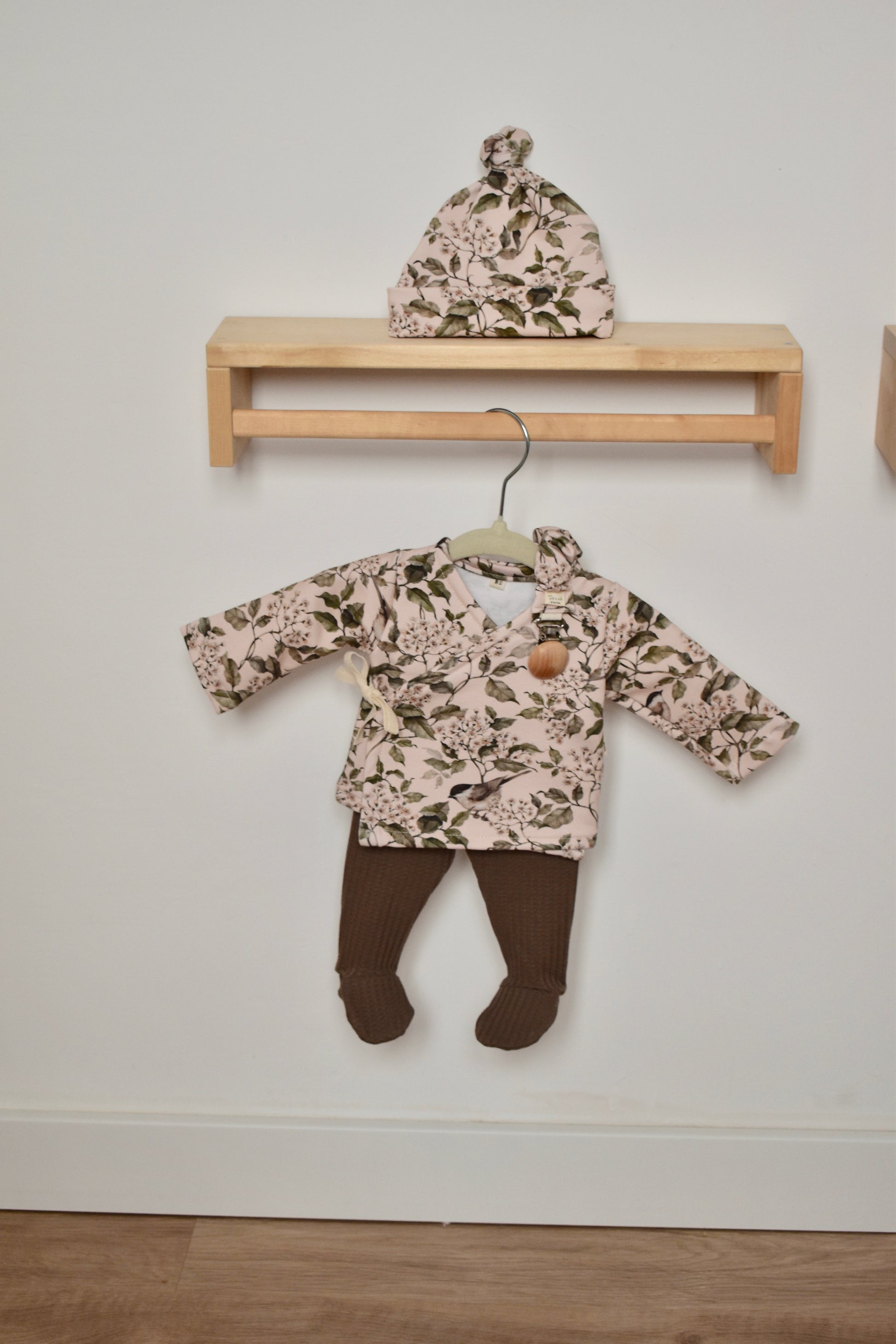 El kimono esta confeccionado con french terry (no afelpado) de algodón orgánico y la parte de abajo esta confeccionada con punto waffle para mayor comodidad del bebé.
