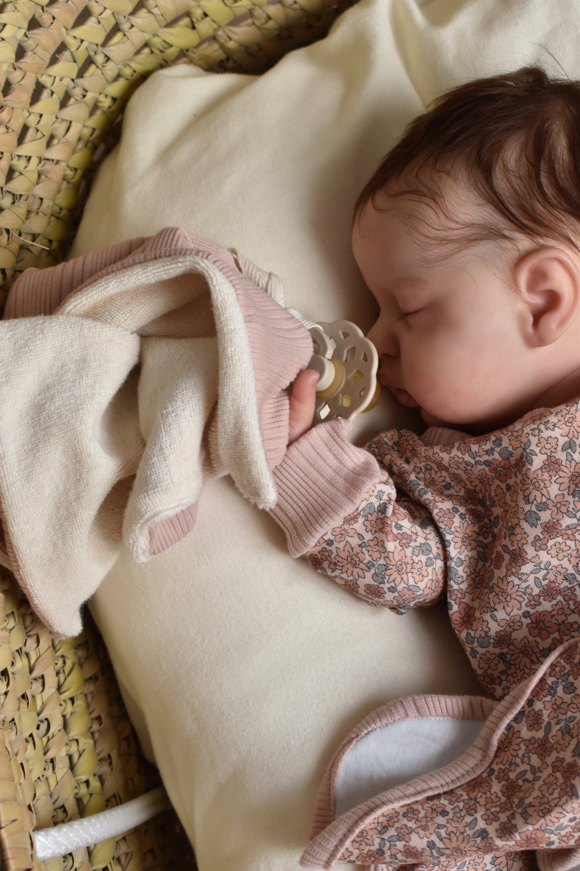 Mantita de apego con una tira para poder enganchar el chupete. Perfecta para que el bebe se sienta a gusto mientras la abraza.