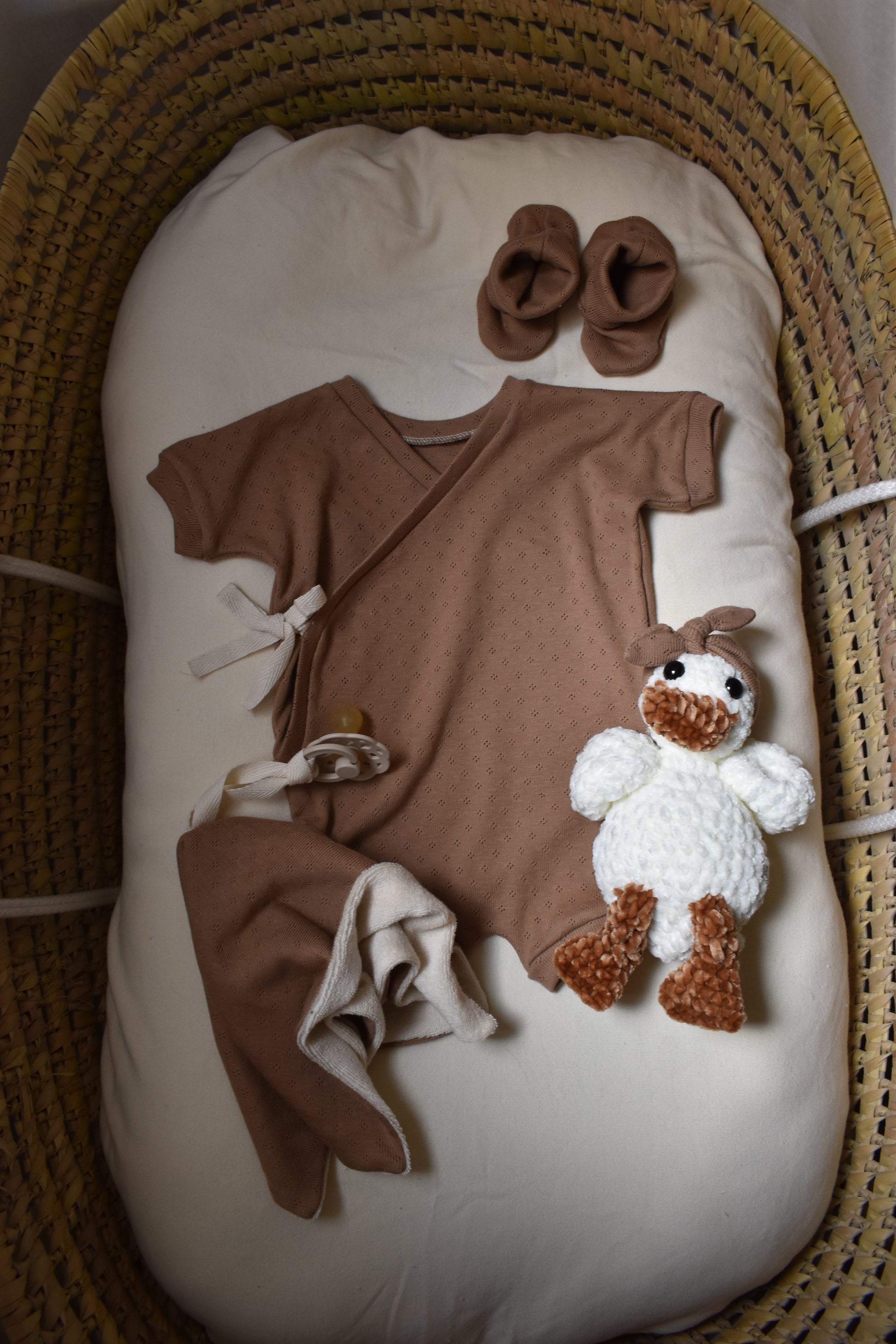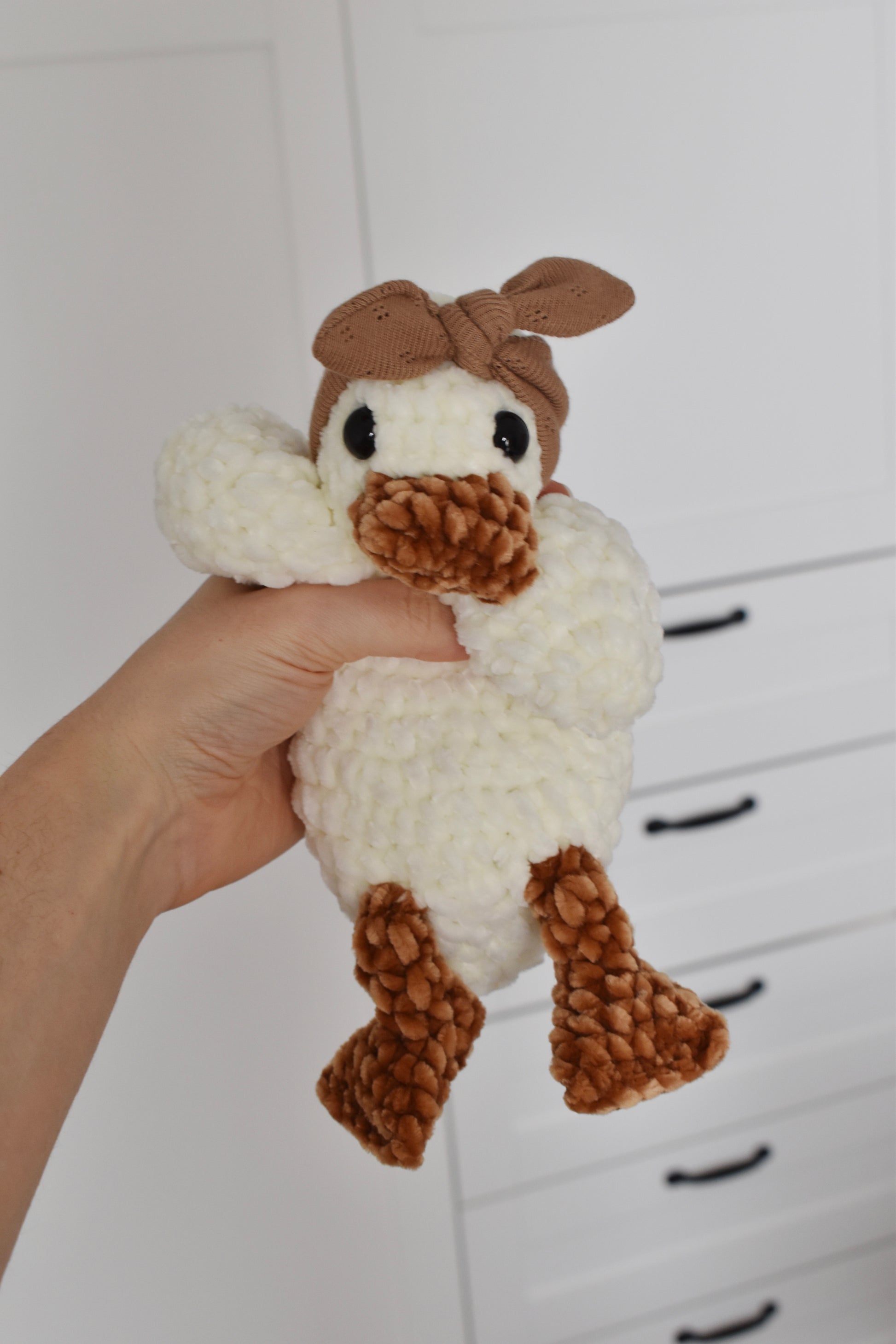 Pato de crochet tejido a mano con lana chenilla, super suave. Diadema con los estampados de la colección