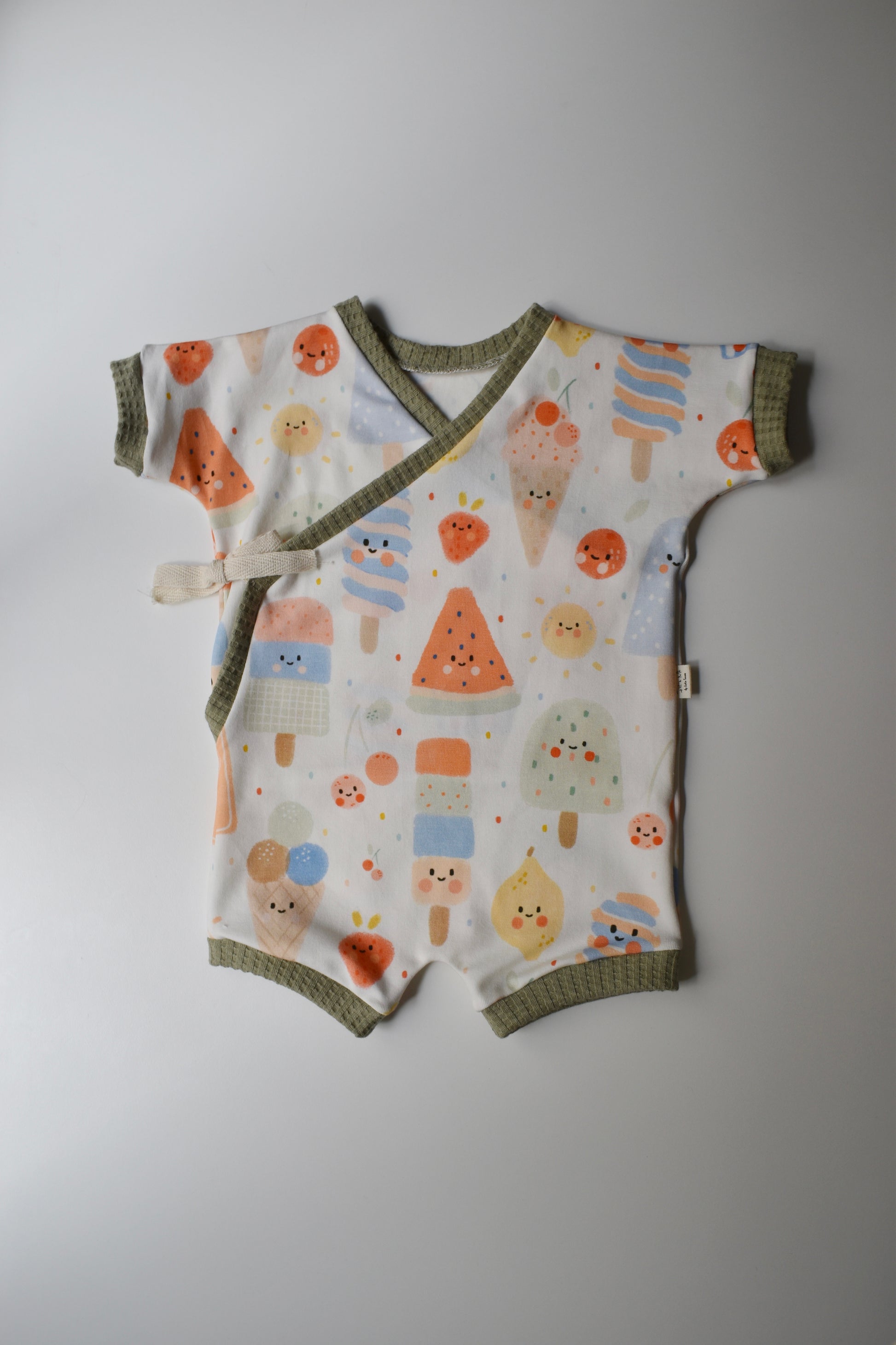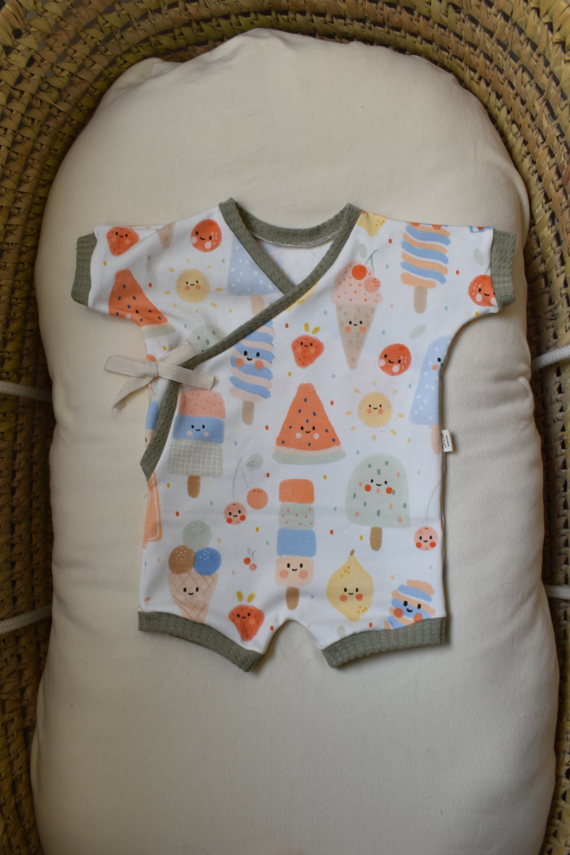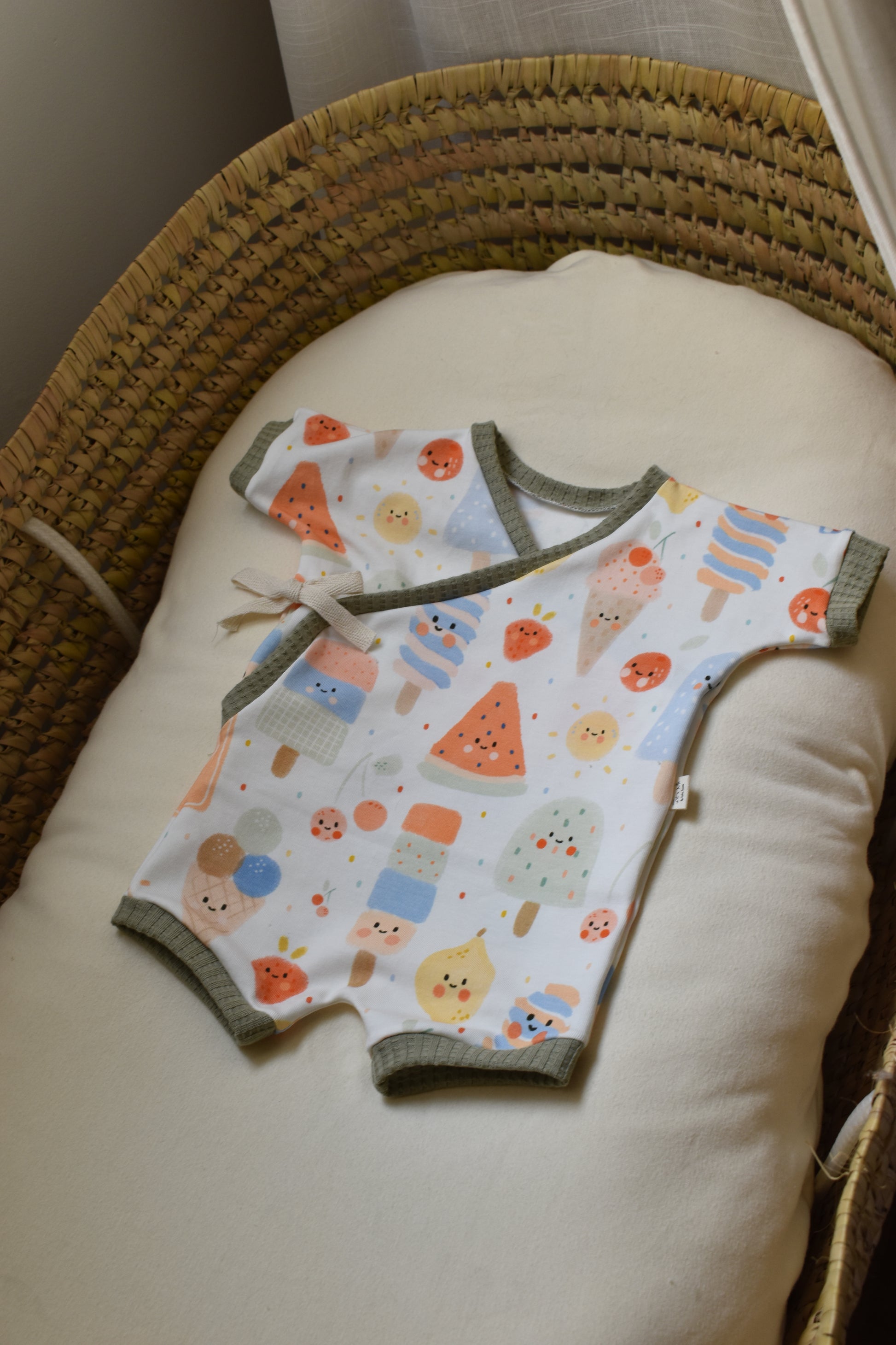 Pelele cruzado anudado con una cinta de algodón. Perfecto para los primeros meses del bebé