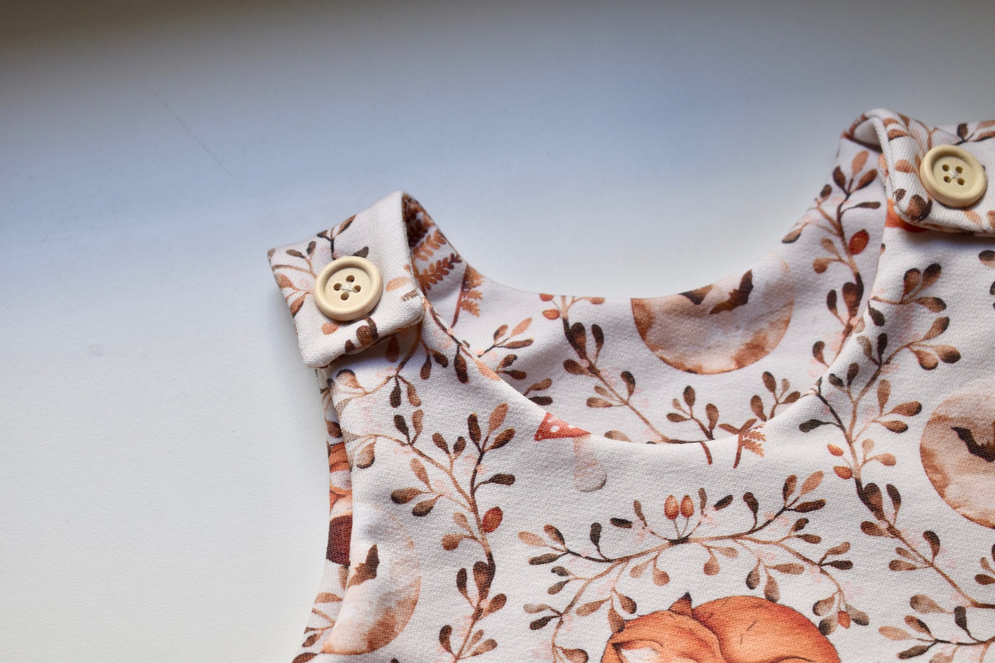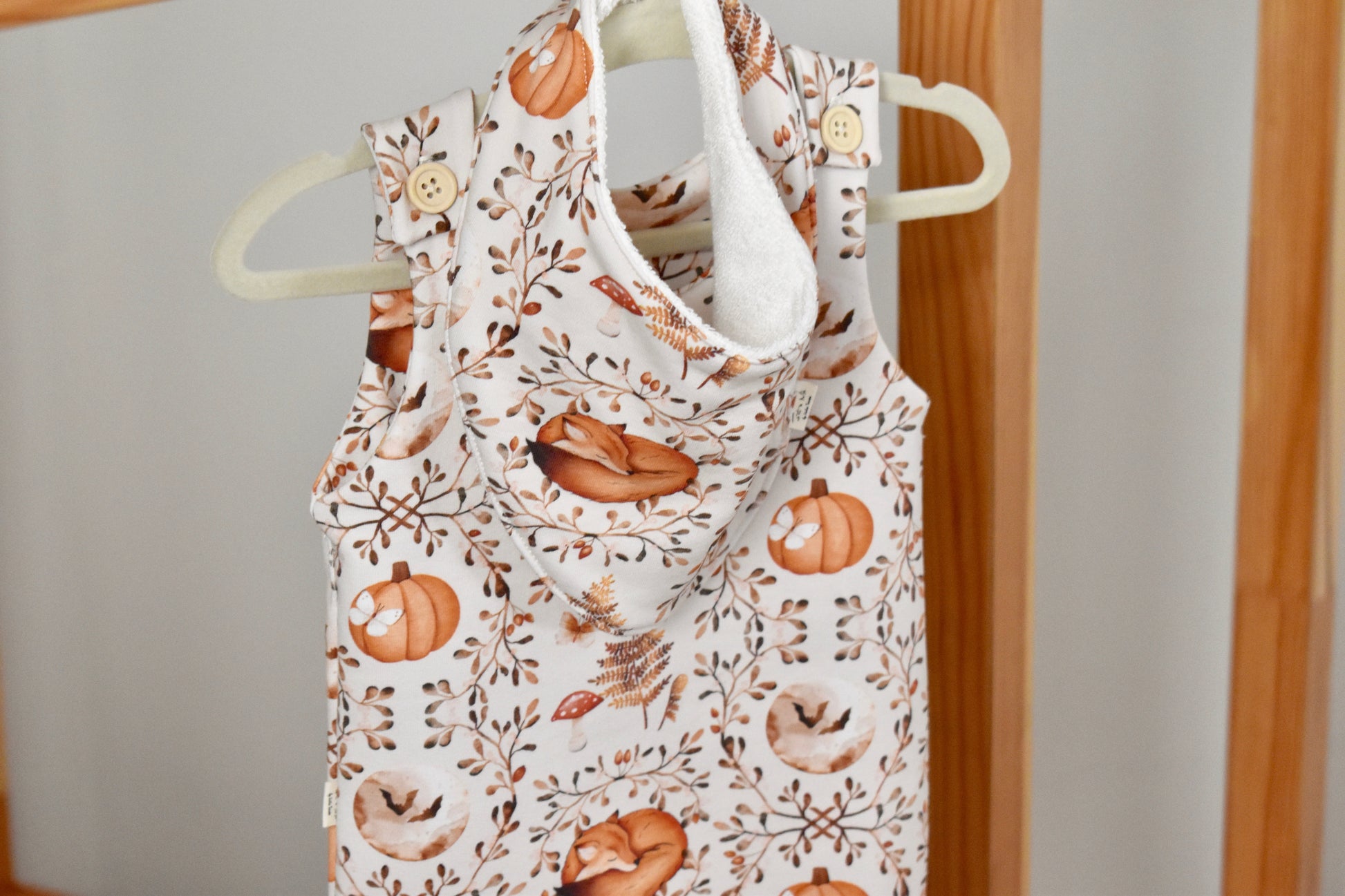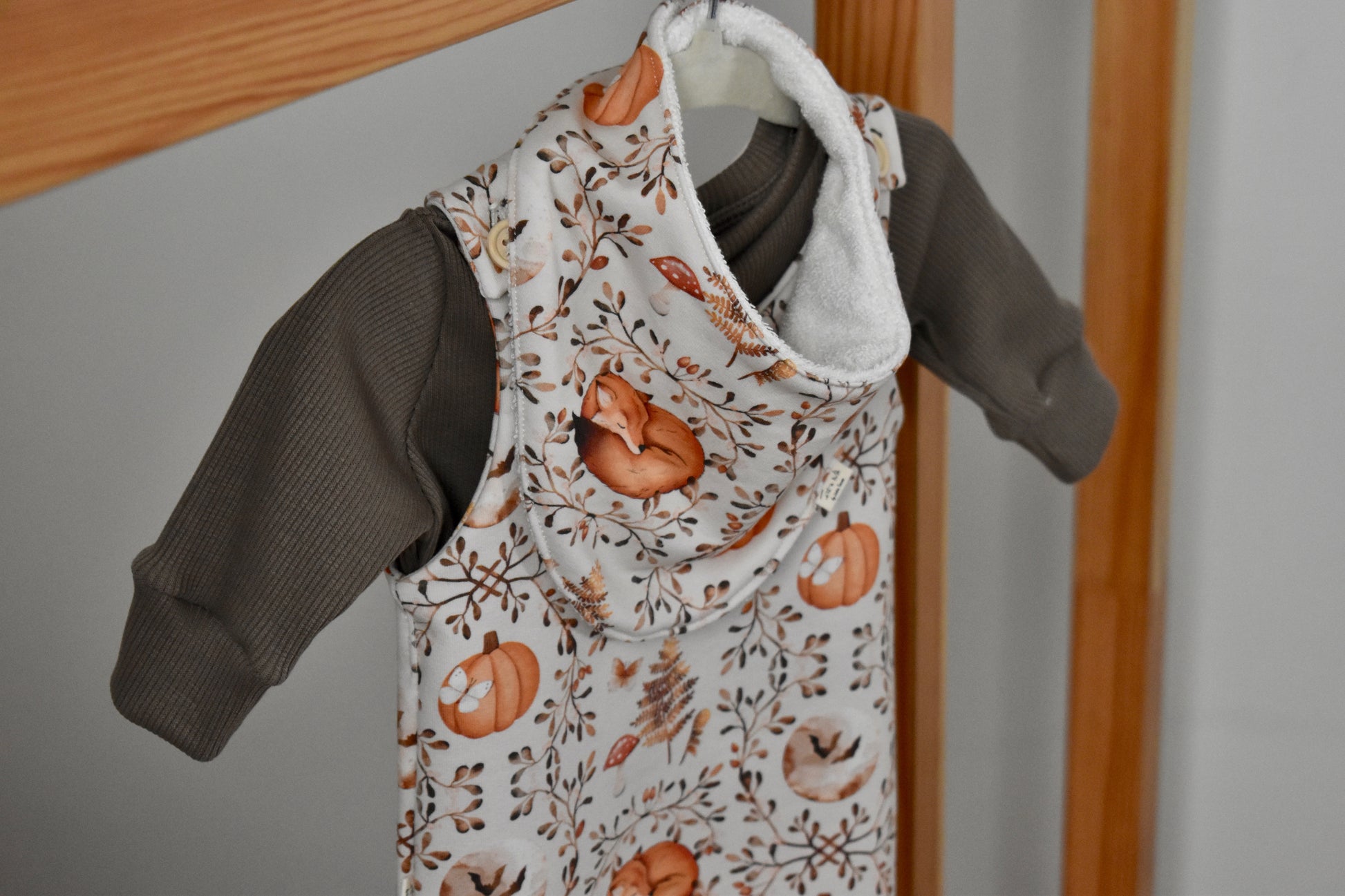 Peto con pies con detalle de botones de madera. Perfecto para que los más pequeños vayan cómodos y calentitos.