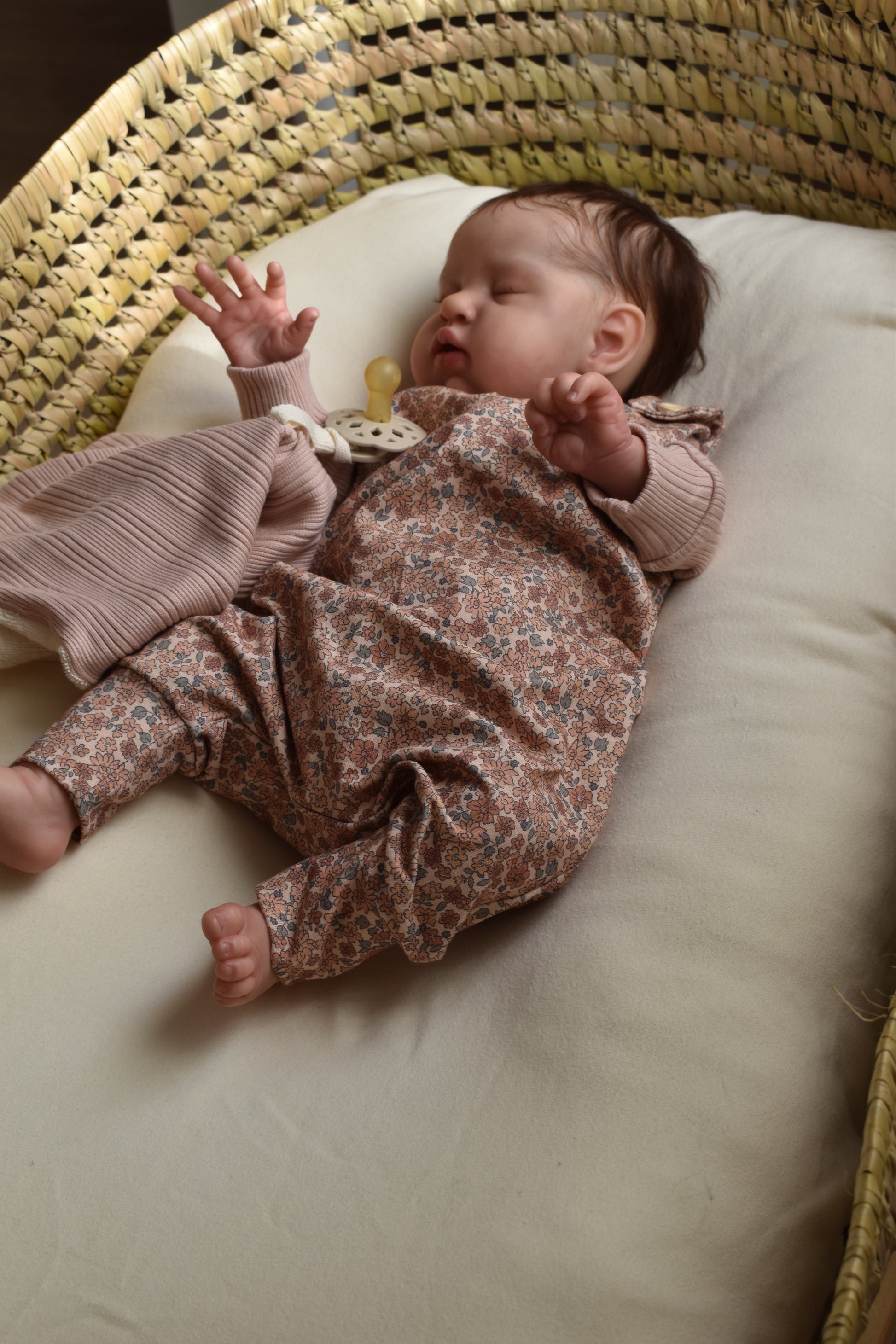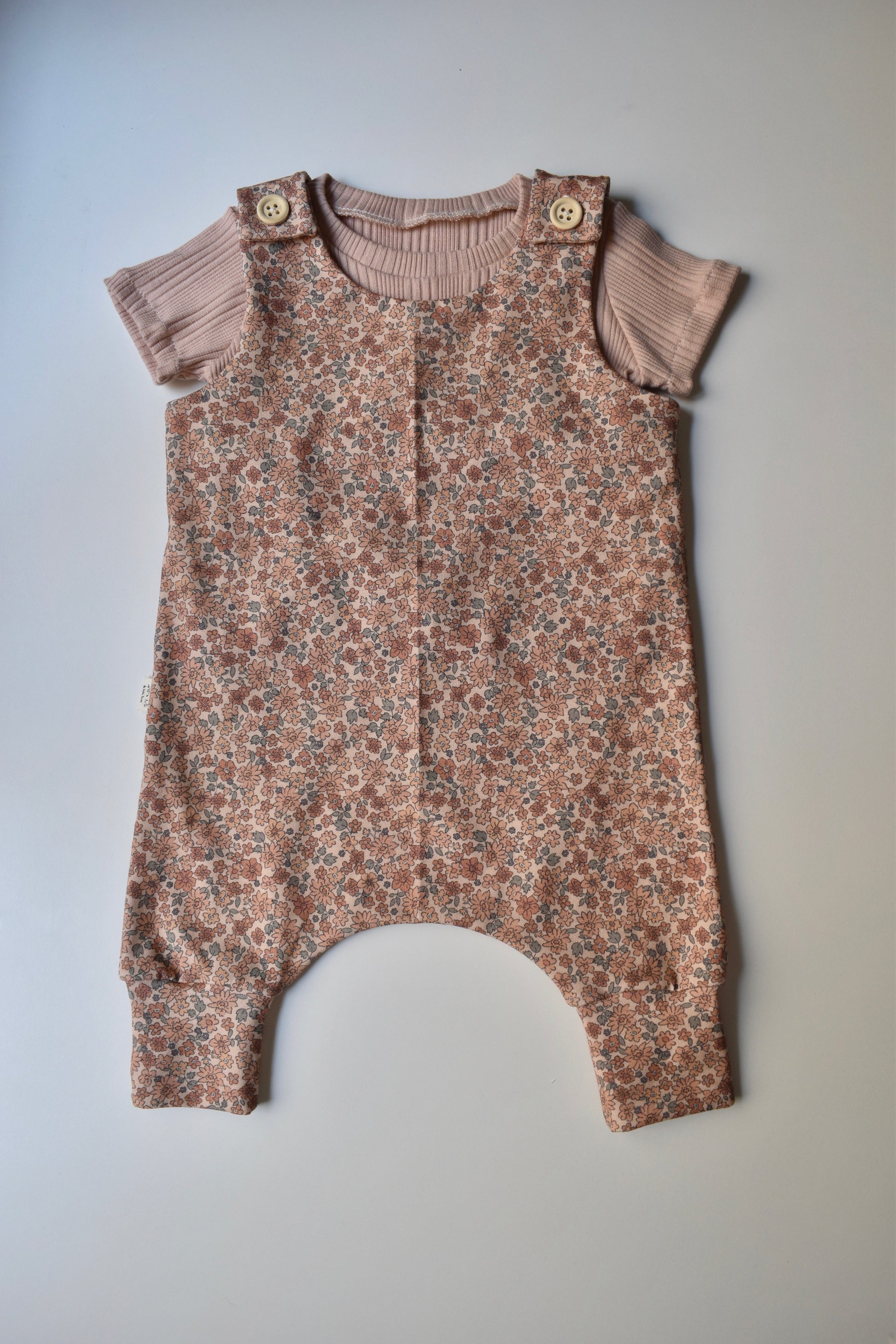 Peto estilo "Harem" peto ancho para mayor comodidad del bebe con puños en los pies para que no se les suba y atado con botones de madera.