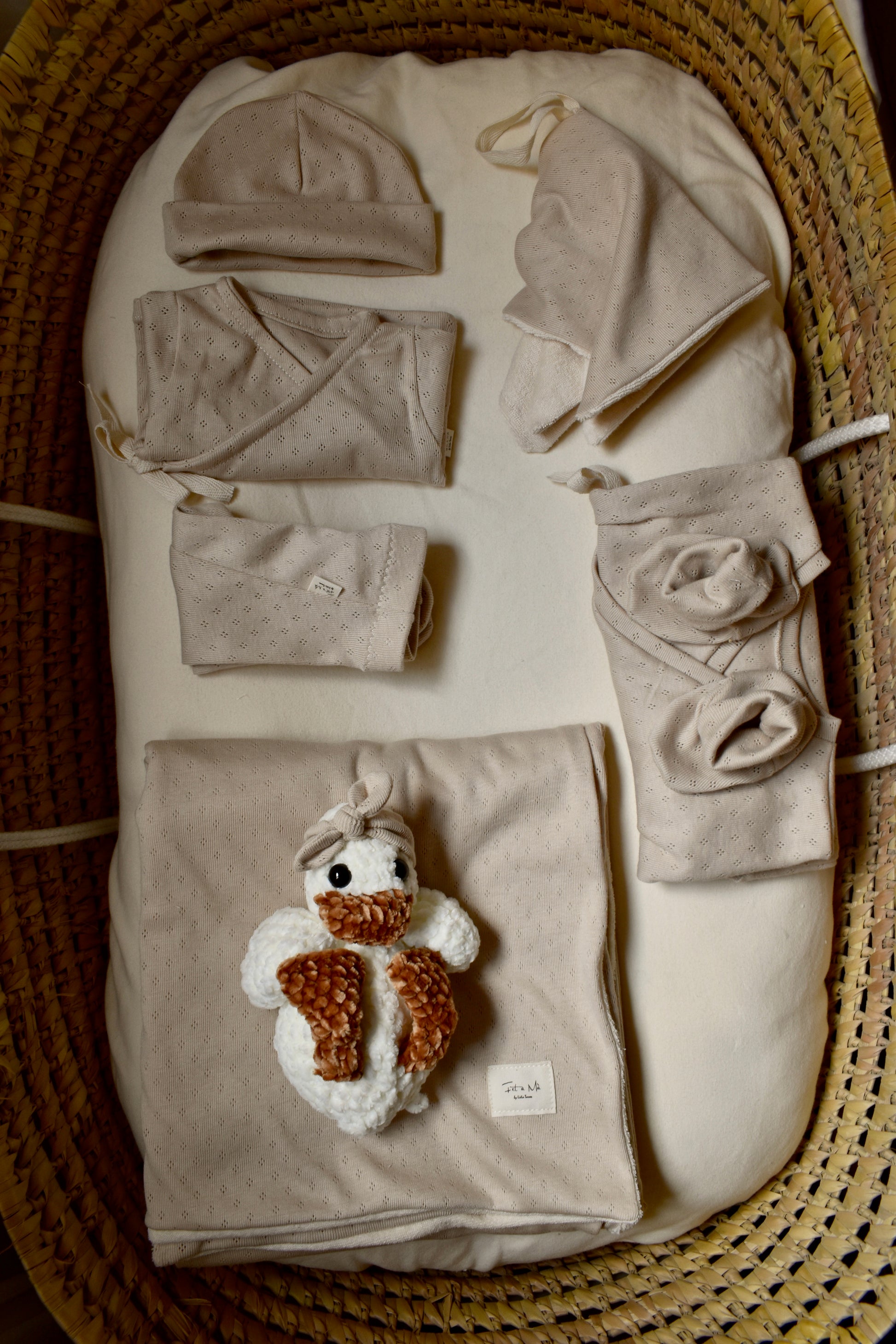 Incluye una primera puesta con blusita estilo kimono, perfecto para el piel con piel, polaina y gorrito. Y para la salida del hospital, un precioso pelele con patucos a juego y mantita con reverso de rizo perfecto para primavera/verano. También incluye una mantita de apego a la que se le puede atar el chupete y un patito super suave y gustoso.