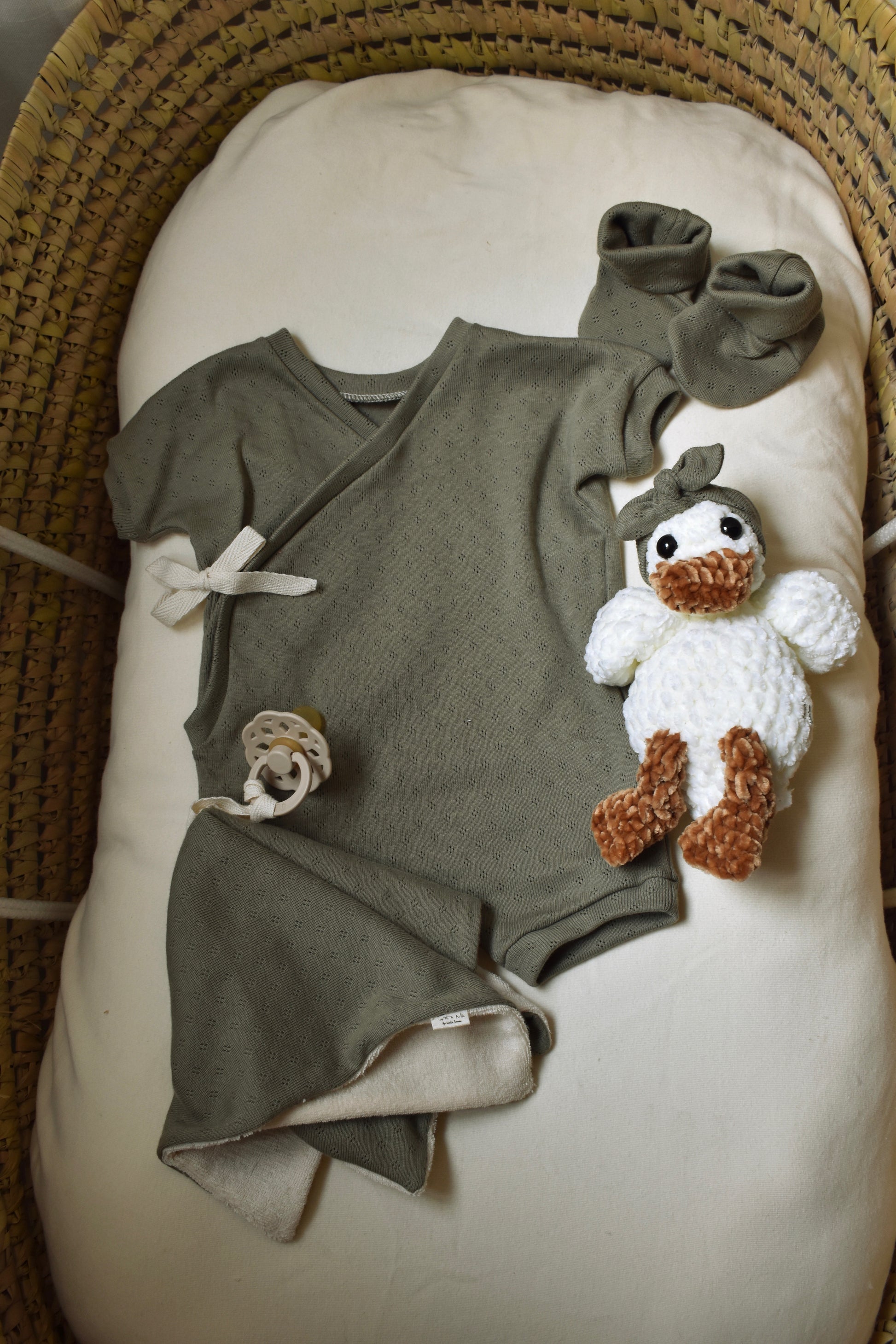 Incluye un precioso pelele con patucos a juego. También incluye una mantita de apego a la que se le puede atar el chupete